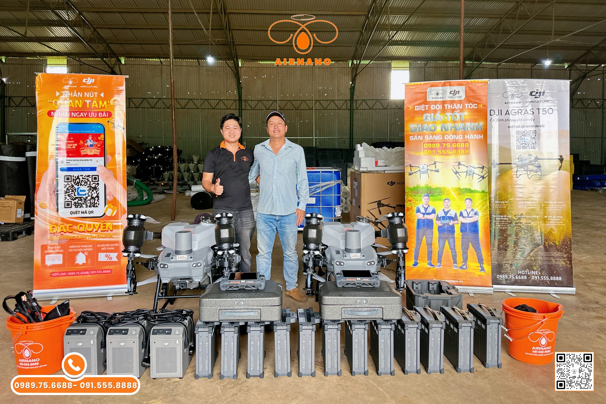 Airnano không chỉ bán máy mà còn cung cấp khóa học vận hành, hướng dẫn bảo trì và thiết lập trung tâm bảo hành trên khắp cả nước. Đội ngũ kỹ thuật viên sẵn sàng hỗ trợ 24/7, giúp bà con giải quyết mọi vấn đề nhanh chóng, từ lỗi hệ thống phun (16-24 L/phút) đến rải hạt (72 kg/phút). Airnano thường xuyên có chương trình ưu đãi như giảm giá hoặc tặng phụ kiện (cáp sạc, bộ làm mát DB800), giúp bà con tiết kiệm chi phí.